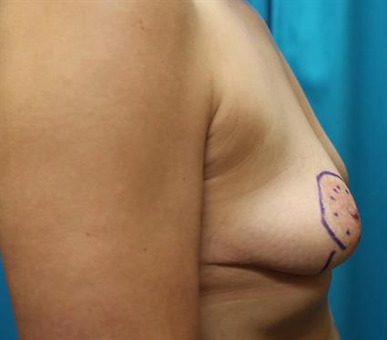 This 52-year-old patient had a desire for larger breasts. As part of her mommy makeover, a bilateral breast augmentation via fat transfer from her thighs was performed by Dr. Janssen. During this procedure, 385 mL of fat was placed into each breast to give her a fuller chest.