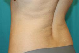 This 47 year old slim female patient had CoolSculpting on her flanks. She had two applications on each side. Upon examination her right flank was larger and denser than the left flank. After 6 weeks, the flanks have been reduced. On the right side the crease, that was below her bra line, is now gone. It is especially evident in the second set of photos.