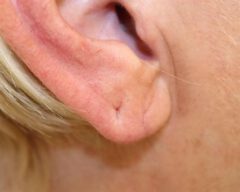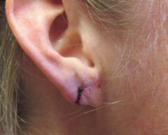 The process for closing normal ear piercings is the same as the one used for repairing “stretched out” holes. Under local anesthesia, skin is removed from around the hole, and the hole is stitched closed. Correction is made by removing the tunnel, and adding a single stitch front and back if the defect is very small. Any re-piercing of the earlobe needs to be in a slightly different location to avoid the denseness of the scar tissue.