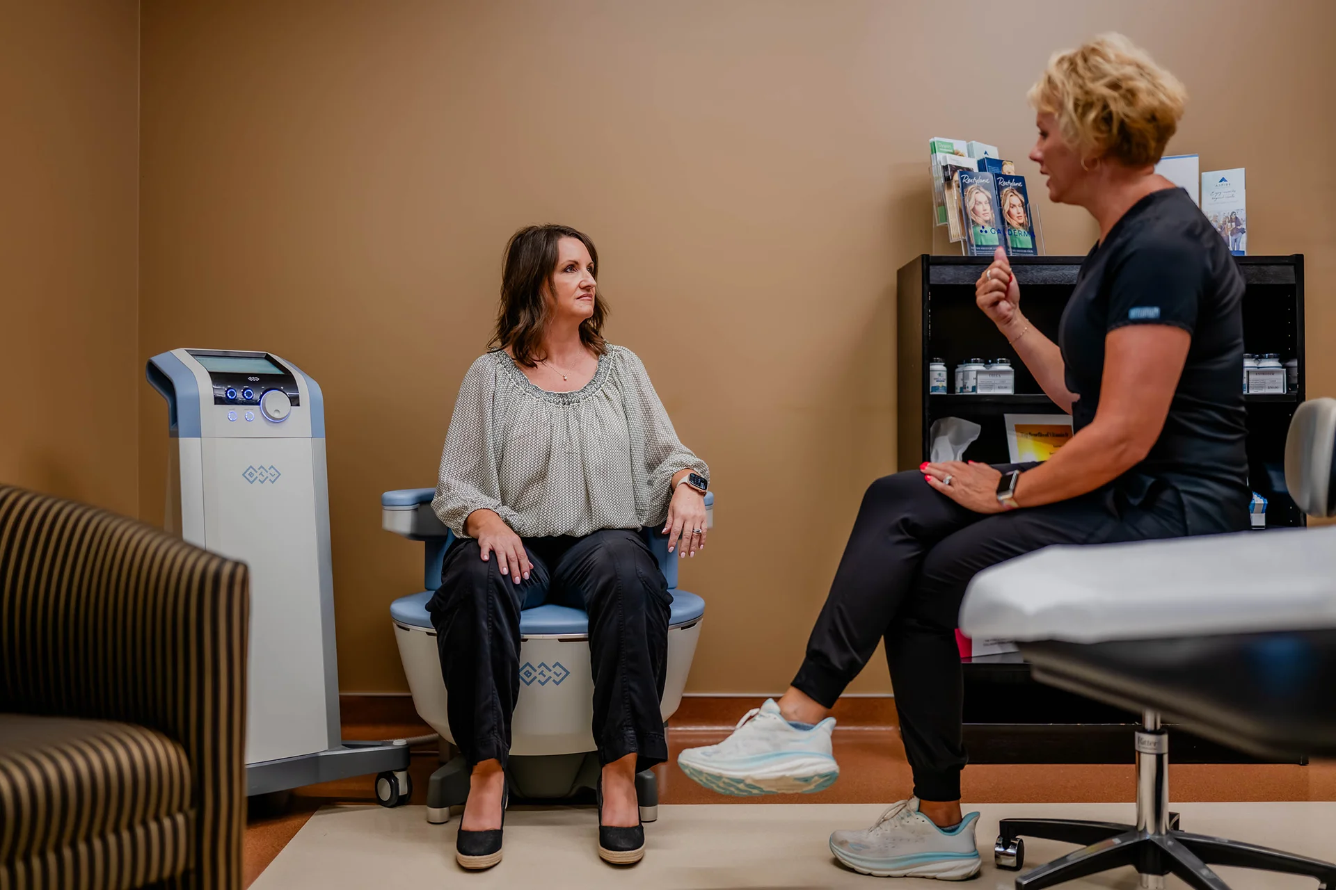 There is typically no pain associated with the treatment and there is no anesthetic required. You will experience gradually increasing tingling and muscle contractions. It will feel more intense as the muscles warm up. The vibrating alternates between fast contractions and deep throbbing, much like a handheld massager. The sensations in the pelvic area are normal and expected, and cause no pain. The intensity level at 100% works best, but it can be lowered if there is discomfort. However, most patients are able to comfortably treated at 100% intensity. You remain fully clothed during the treatment, and may resume normal daily activities immediately after the treatment.