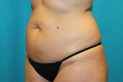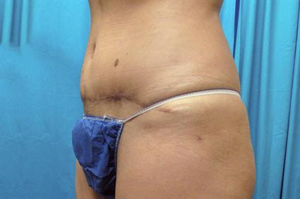 This 45 year old patient did not like the looseness of her lower abdominal skin and the fullness of her hips. Since she did not need muscle tightening, she had a moderate abdominoplasty and liposuction of her hip, thighs and bra fat area in the back. Dr. Janssen excised an abdominal pannus of 1052g of tissue. Liposuction removed approximately 50 mL of fat from the upper abdomen over the rib margin areas, 500 mL of fat from each hip, 350 mL from bilateral inner thighs, 500 mL from bilateral outer thighs, and 100 mL from the back.