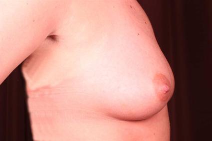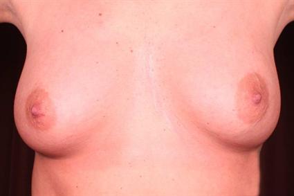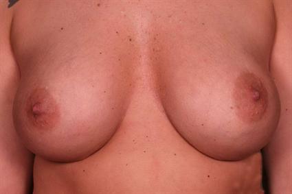 Patient had a 300cc silicone implant on the left side and a 250 cc implant on the right side all placed subglandular. Because of the noticeable breast assymetry, the left inframammary fold was lowered and a larger implant was used.