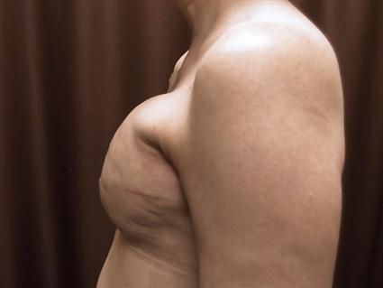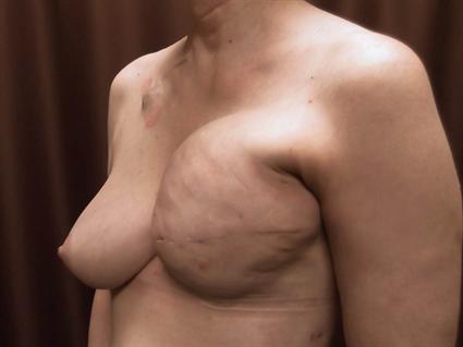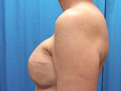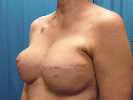 This was a difficult case of a 58 year old patient with a history of left breast cancer and mastectomy. When she had a repeat of cancer in her left breast, a mastectomy was performed and tissue expander was placed at the same time. Her nipple areolar complex sat low on her left side. For this next operation, a breast lift was performed on the right side to re-level her. A standard circumvertical mastopexy was performed with elevation of the skin with a diamond shape excision. Her left breast used a Mentor MemoryShape breast implant medium height high profile.