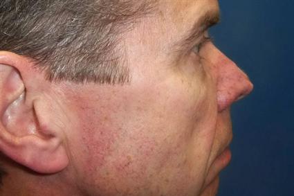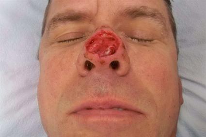 Patient had previous basal cell carcinoma on his nose, which was eliminated with a Mohs procedure. We closed the open wound with a full thickness skin graft taken from behind the left ear.