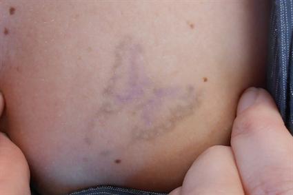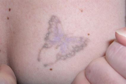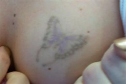 This 34 year old patient was tired of her butterfly tattoo on her breast, and wanted it removed. Post-op photo was taken after six treatments. The original tattoo had three colors, was ten years old and was approximately 2″ x 2″.