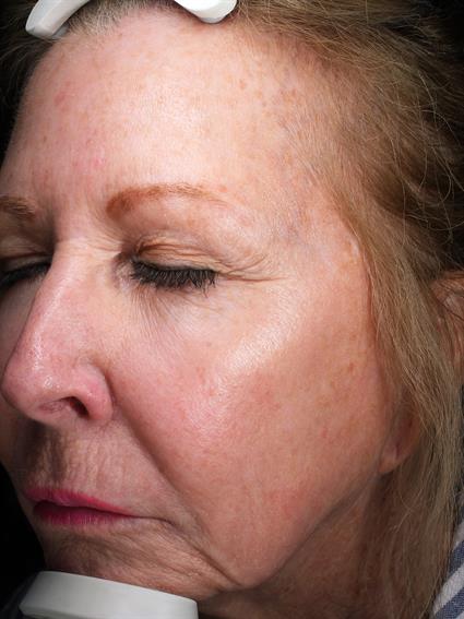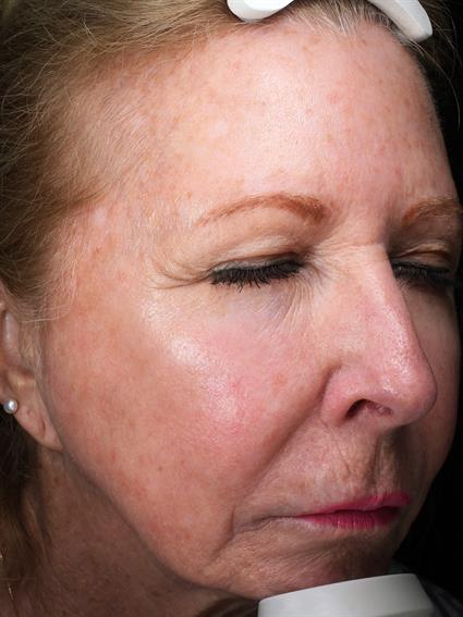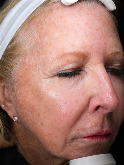 This 74-year-old female patient presented with significant cumulative facial sun damage. VISIA analysis demonstrated extensive underlying UV damage. Initial treatment with Sciton BBL HERO was performed to address diffuse photodamage and dyschromia. She subsequently underwent a series of Levulan treatments, resulting in resolution of actinic keratoses.Despite improvement of precancerous lesions, residual solar lentigines and hyperpigmentation persisted. A combination of Sciton BBL HERO and NanoLaser Peel was selected to target remaining pigment and promote epidermal renewal with minimal downtime. At 4 weeks post-treatment, the patient demonstrated marked improvement in hyperpigmentation and overall skin tone.